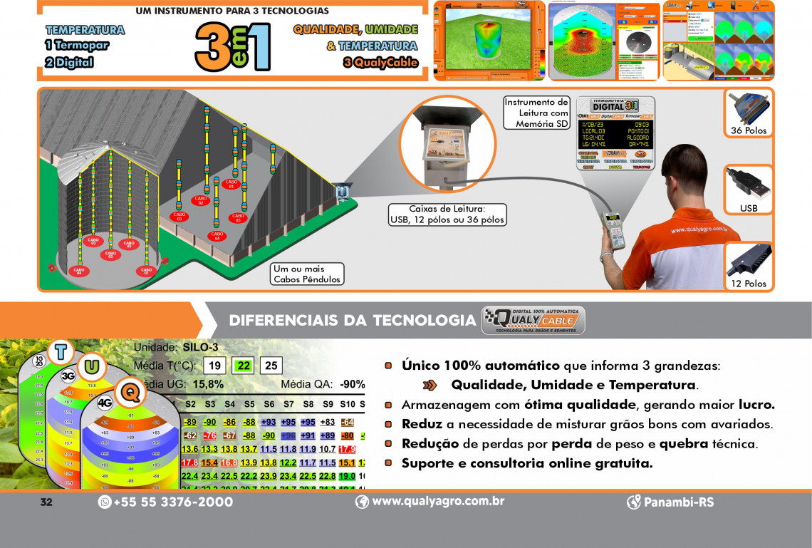 Simples operação e conexão USB com a caixa de leitura: reconhece os dados do silo, realiza leituras, e efetua o registro das leituras no cartão de memória SD.