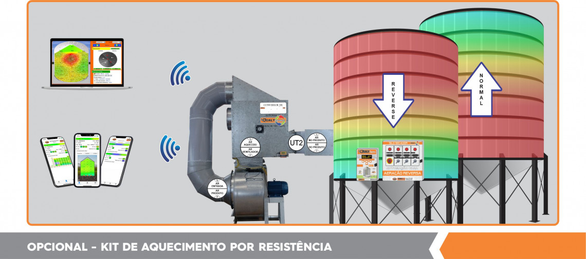 • Na aeração normal, é possível utilizar um kit de aquecimento por resitência, responsável por realizar o aquecimento do ar e aplicar uma condição de secagem forçada, sendo assim um equipamento utilizado para silo secador, melhorando a eficiência do efeito da secagem.